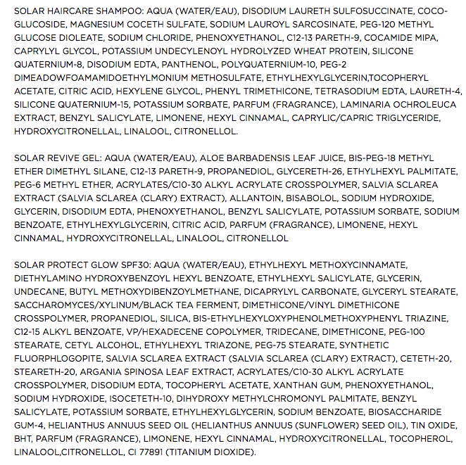 - e un prodotto esclusivo un Solar Haircare Shampoo, riuscitissimo shampoo riparatore doposole per nutrire a fondo i capelli stressati da sole, vento e acqua, perfetto per i miei capelli colorati e sfibrati, secchi poiché lava, nutre e idrata ottimamente, lasciando la capigliatura luminosa e brillante.